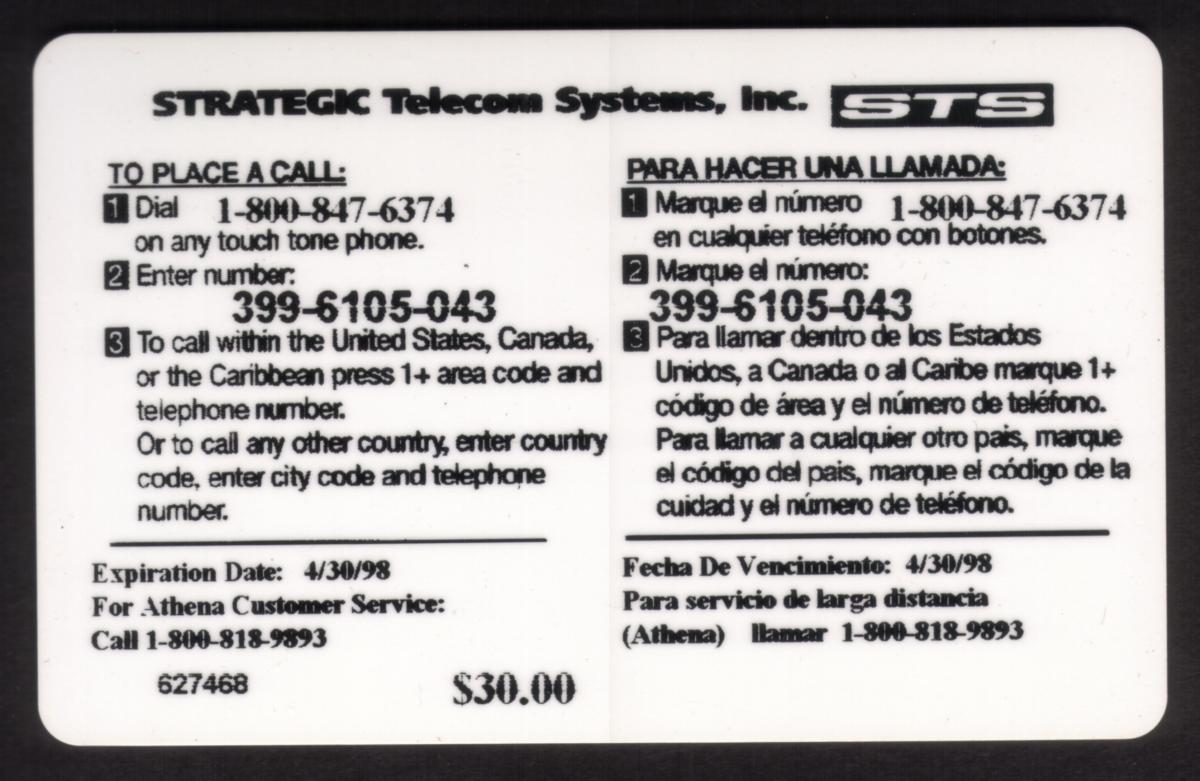 This card is identified as used and expired, associated with Strategic Telecom Systems and related to the Middle East Calling series featuring Arabic letters. The denomination stated is athena $30.