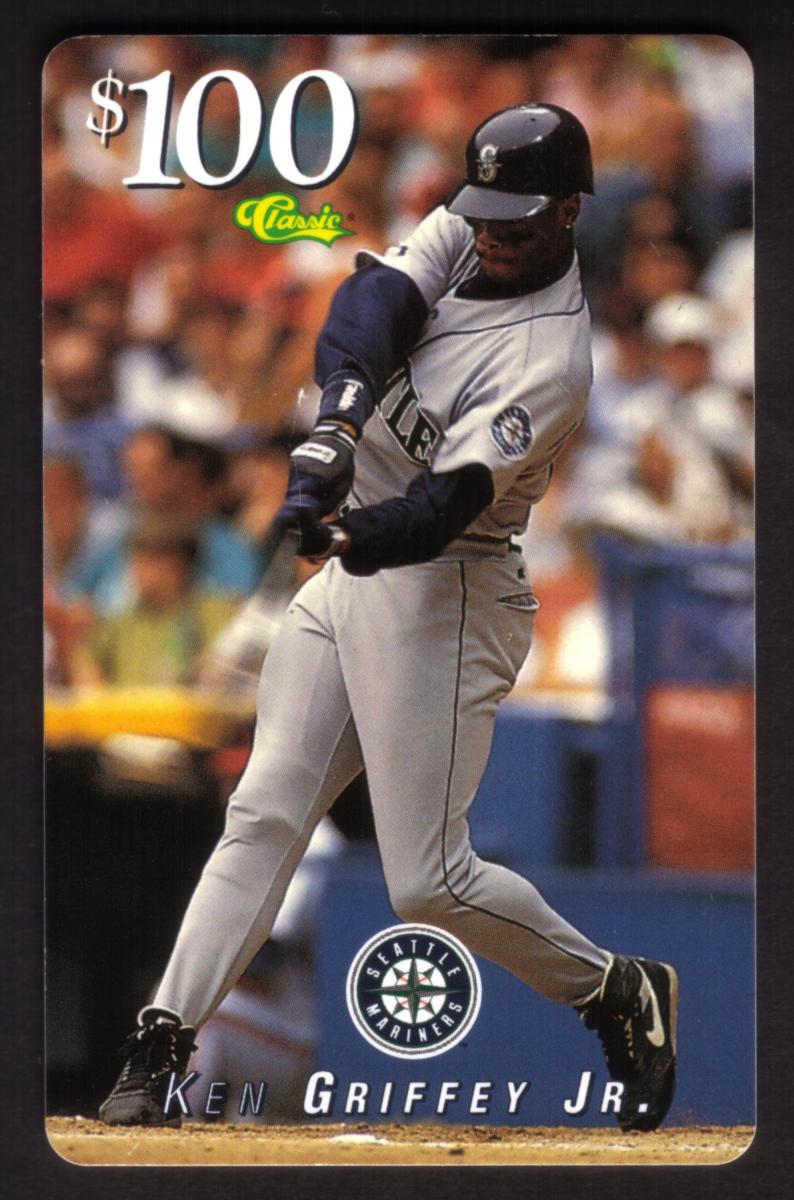 The card prominently shows a value of $100 in the upper left corner, accompanied by the word "Classic" in green script beneath it. The Seattle Mariners logo is centered near the bottom of the card. Directly below the logo, the player’s name "Ken Griffey Jr." is printed in white uppercase letters, with the team name integrated into the player’s name area.