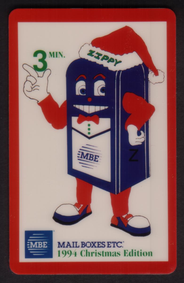 This collectible phone card features a character named "Zippy," a blue mailbox with anthropomorphic traits, including eyes, a broad smiling mouth with visible teeth, and expressive white-gloved hands. Zippy is wearing a red Santa Claus hat with white trim and a pom-pom, which has the name "ZIPPY" written in green on the white band. The mailbox character has red legs and arms, red shoes with white details, and a red bow tie. On its front panel, the blue mailbox prominently displays the "MBE" logo inside a white rectangular area representing a slot or door.