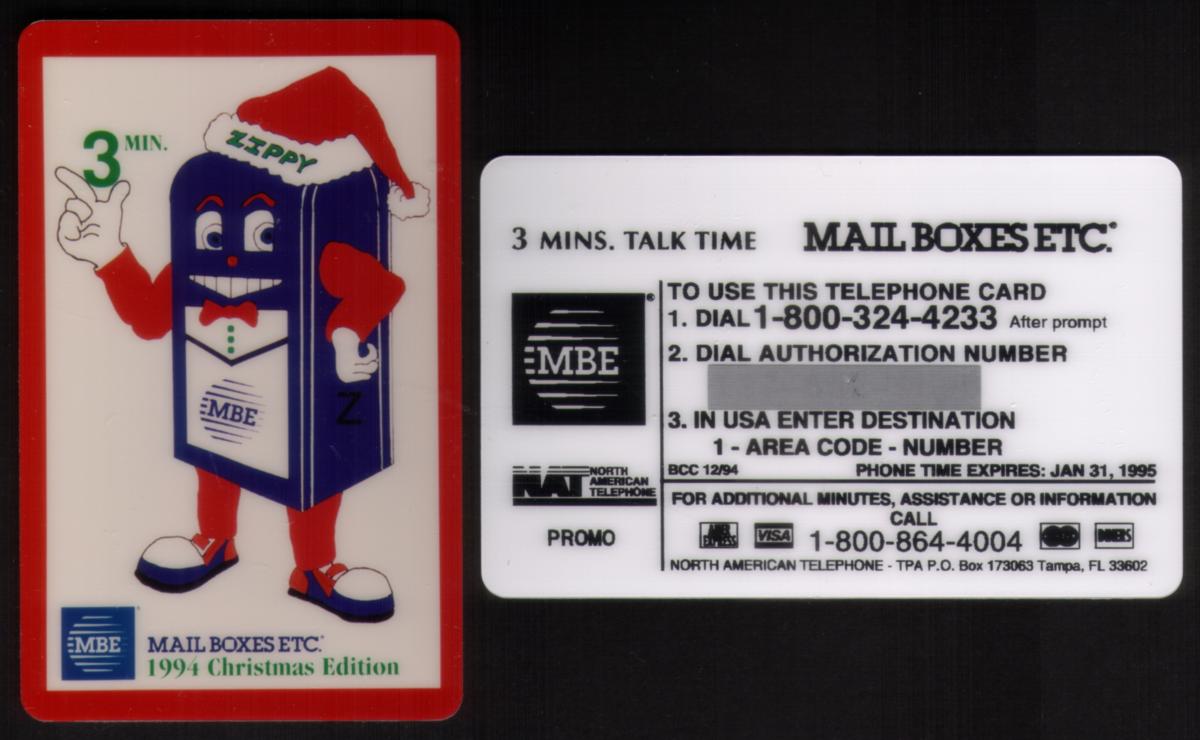 The card has a bright red border framing the image. Near the bottom left corner, the "MBE" logo appears again in a blue square, alongside the text "MAIL BOXES ETC." in green. Below that, the card is labeled "1994 Christmas Edition," signifying this card was issued for the holiday season in 1994 by Mail Boxes Etc.