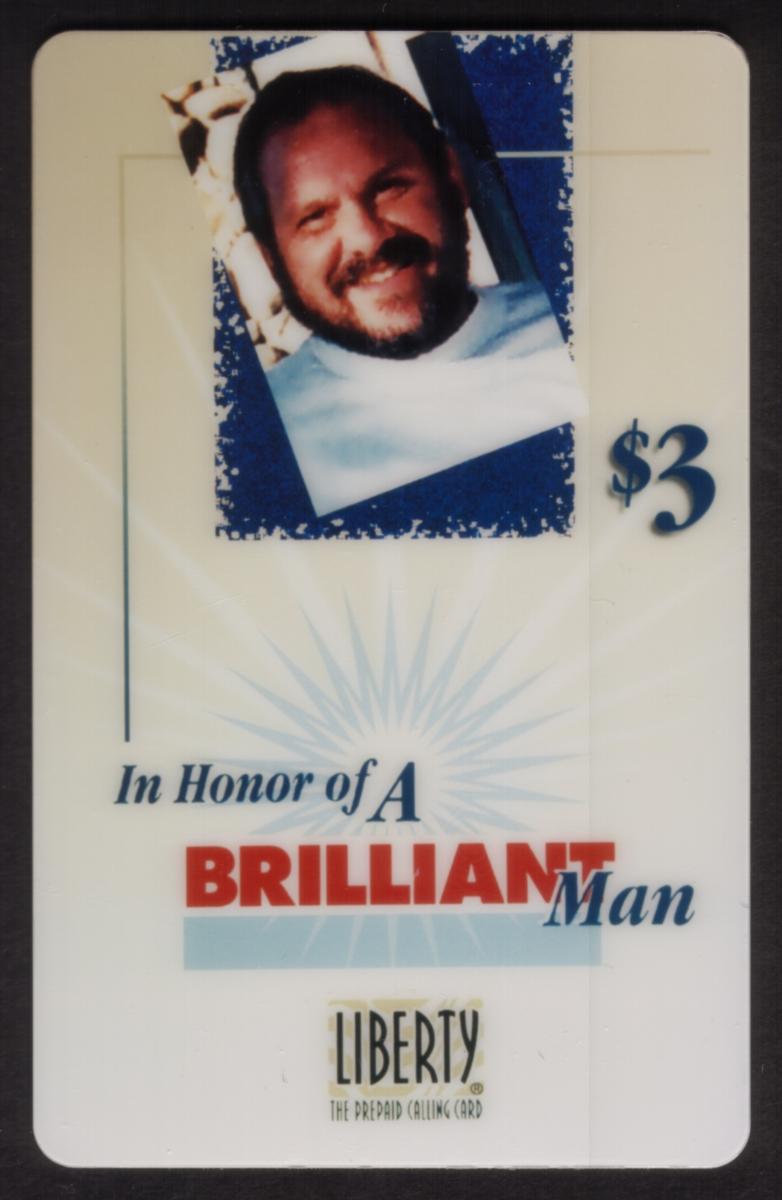 At the bottom of the card is the Liberty logo, accompanied by the phrase "THE PREPAID CALLING CARD," identifying the card as a prepaid telephone card issued by Liberty. The design uses a clean white background with a subtle sunburst graphic in pale blue behind the main text, drawing attention to the tribute. This card is associated with the Quest Group International and commemorates Larry Brilliant, a figure recognized for his impact within the telephone card and philanthropic community.