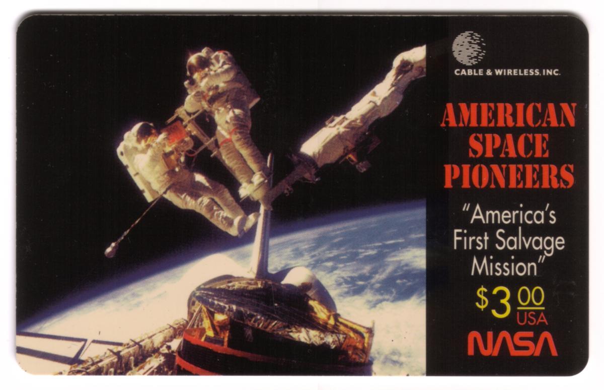 This collectible phone card features an iconic image of an astronaut conducting a spacewalk during NASA's first salvage mission. The astronaut is tethered and working on a large satellite or spacecraft component, set against the dramatic backdrop of Earth’s curvature beneath the darkness of outer space. The Earth’s blue atmosphere and white clouds are visible below, emphasizing the high-altitude environment.