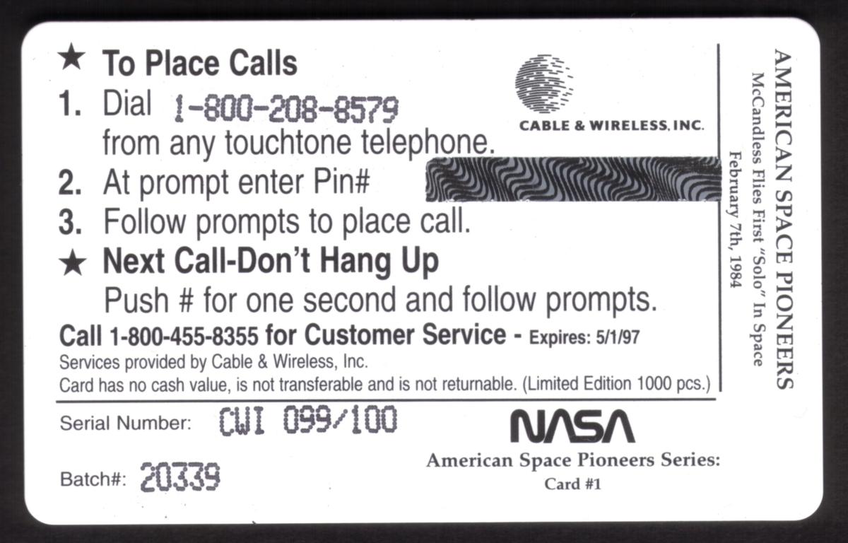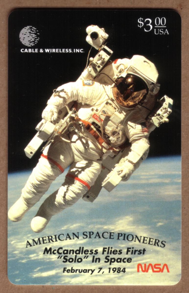 This card commemorates Bruce McCandless II’s milestone as the first person to perform an untethered spacewalk using NASA technology during the Space Shuttle Challenger mission STS-41-B. It merges aerospace achievement with cable communication branding from Cable & Wireless, Inc.