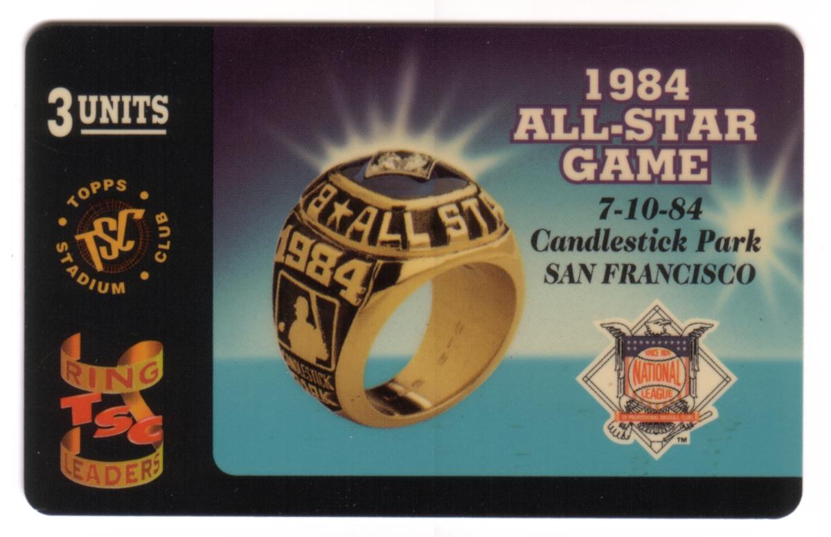 On the left side of the card, a black vertical band includes the Topps Stadium Club logo with the words “Ring Leaders” arranged within a stylized ribbon graphic in red and yellow. The card is marked as “3 Units” in the top left corner, indicating its value for telephone use. Additional text on the card displays "1984 ALL-STAR GAME" in bold letters above the date and location details, as well as the National League emblem near the bottom right.