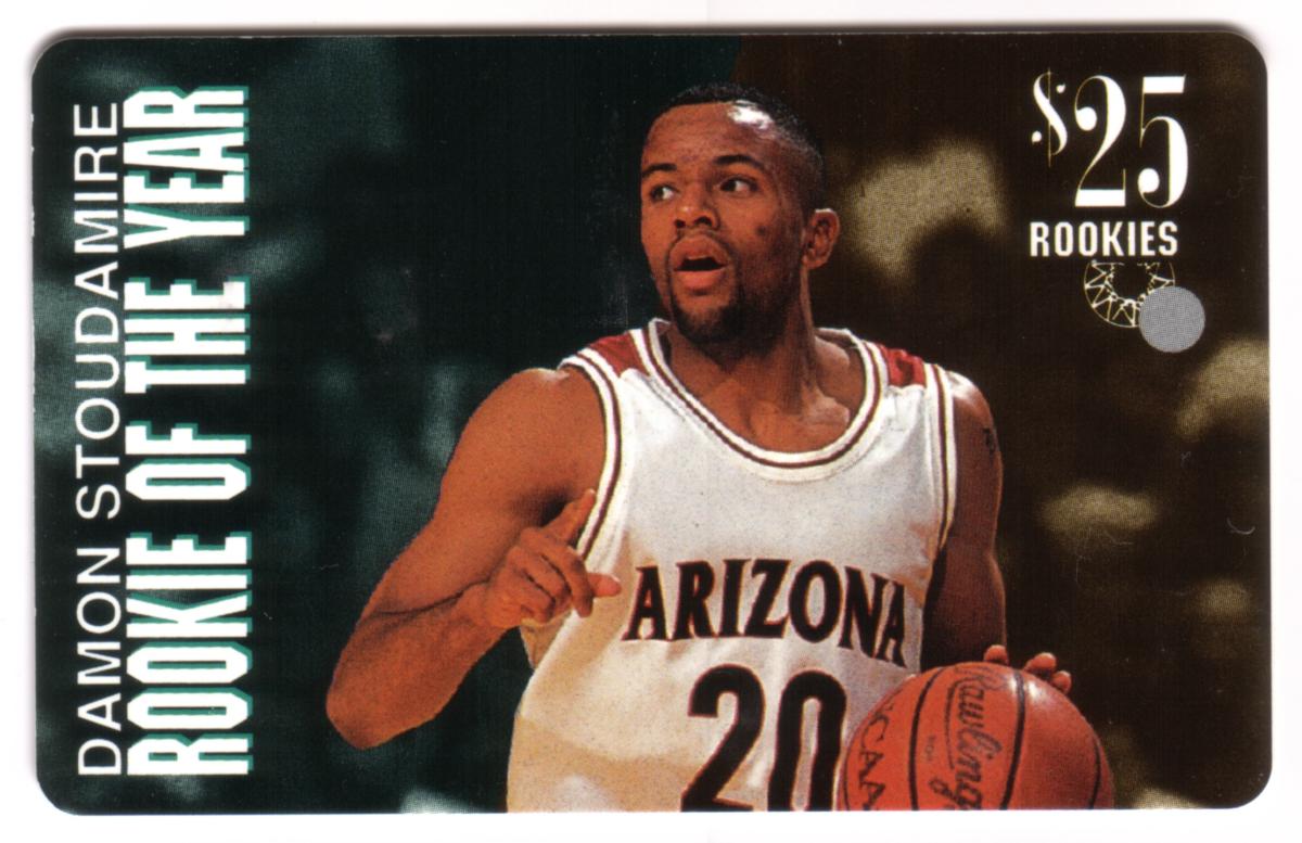 This card clearly highlights Damon Stoudamire’s early basketball career, marking him as a standout rookie player for the Arizona Wildcats. The design focuses on his athletic presence and rookie status, making it a valuable collectible for basketball fans and sports memorabilia collectors.