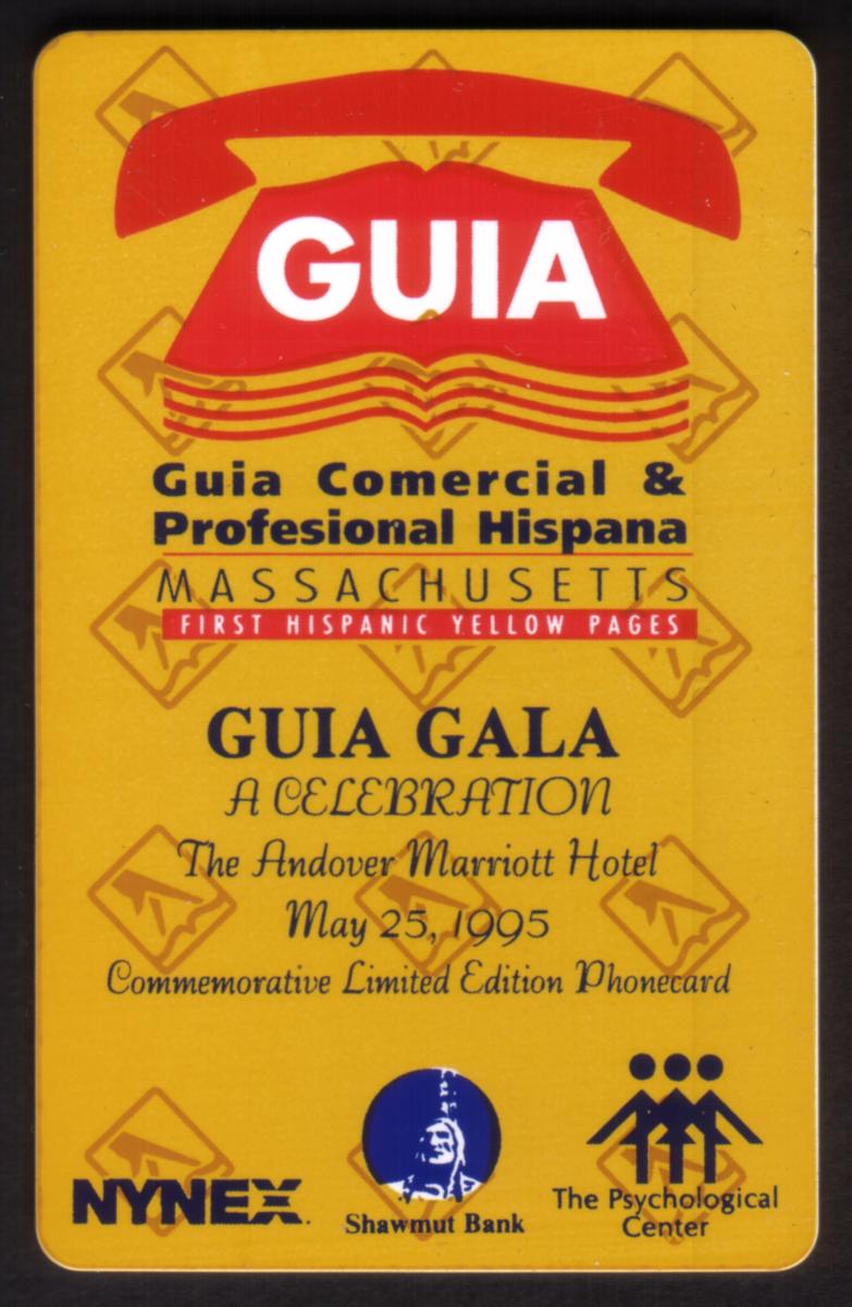 This collectible phone card commemorates the Guia Gala event celebrating the first Hispanic Yellow Pages in Massachusetts. The card prominently displays a red telephone icon above the word "GUIA" in bold white letters at the top center. Below this, the text reads "Guia Comercial & Profesional Hispana" followed by "Massachusetts" highlighted in yellow with the phrase "FIRST HISPANIC YELLOW PAGES" underneath in white on a red background.