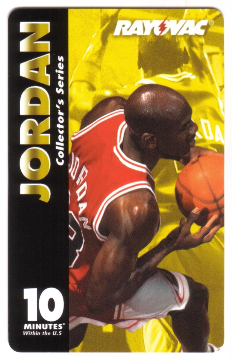 The left side of the card contains a black vertical strip where the word "JORDAN" is displayed prominently in large gold and white letters, with "Collector's Series" written vertically below it in white text. The top right corner includes the Rayovac logo in white and red, identifying the card as part of a promotional or branded series. At the bottom left, the card indicates "10 MINUTES* Within the U.S." in bold white letters, showing the card’s usage value.