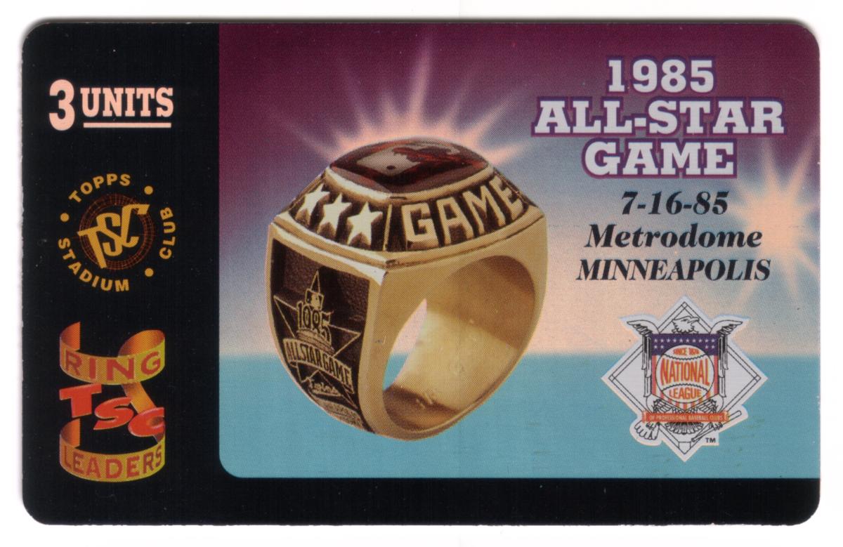 On the left side, the card features the "3 UNITS" denomination, along with the "TOPPS STADIUM CLUB" logo in gold and the series name "RING LEADERS" written in red and orange banners curving around the TSC emblem. The imagery and text identify the card as part of the Topps Stadium Club Ring Leaders series tied to Major League Baseball’s 1985 All-Star Game held at the Metrodome in Minneapolis, Minnesota. This card represents a collectible related to baseball memorabilia endorsed by MCI Communications.