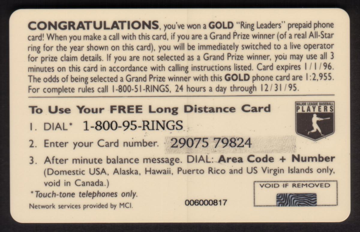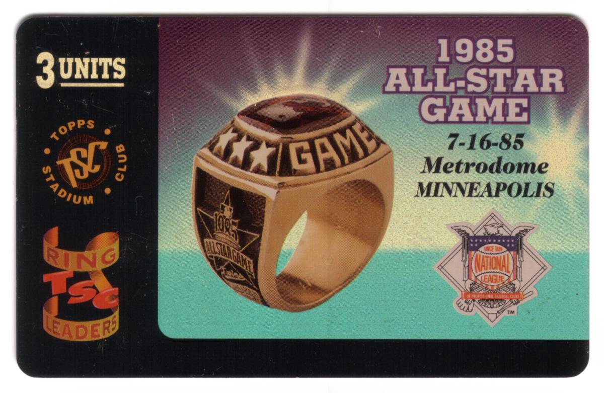 This card is associated with the Topps Stadium Club Ring Leaders series and commemorates the 1985 Major League Baseball All-Star Game held at the Metrodome in Minneapolis, Minnesota. It highlights the National League's role in this historic baseball event. The card was produced by MCI Communications and is a collectible item connected to professional baseball history.