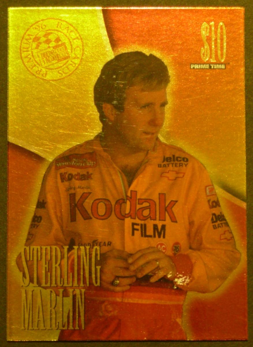 The card has a striking gold and orange color scheme that blends into a bright background. In the top left corner, there is a circular emblem that reads "PREMIUM RACE CARDS." The upper right corner displays a "$10 PRIME TIME" value marking. Sterling Marlin's name appears in large gold text at the bottom left of the card.