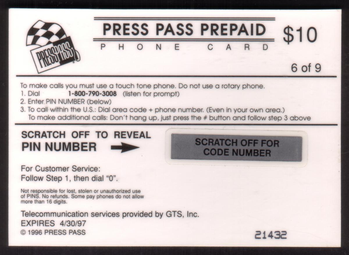 This card is part of the 1996 Press Pass Racing series, specifically highlighting NASCAR and auto racing themes. It is number 6 out of 9 and produced in association with Kodak film and Global Tel. Solutions. The design emphasizes racing and automotive culture with a premium, collectible presentation.