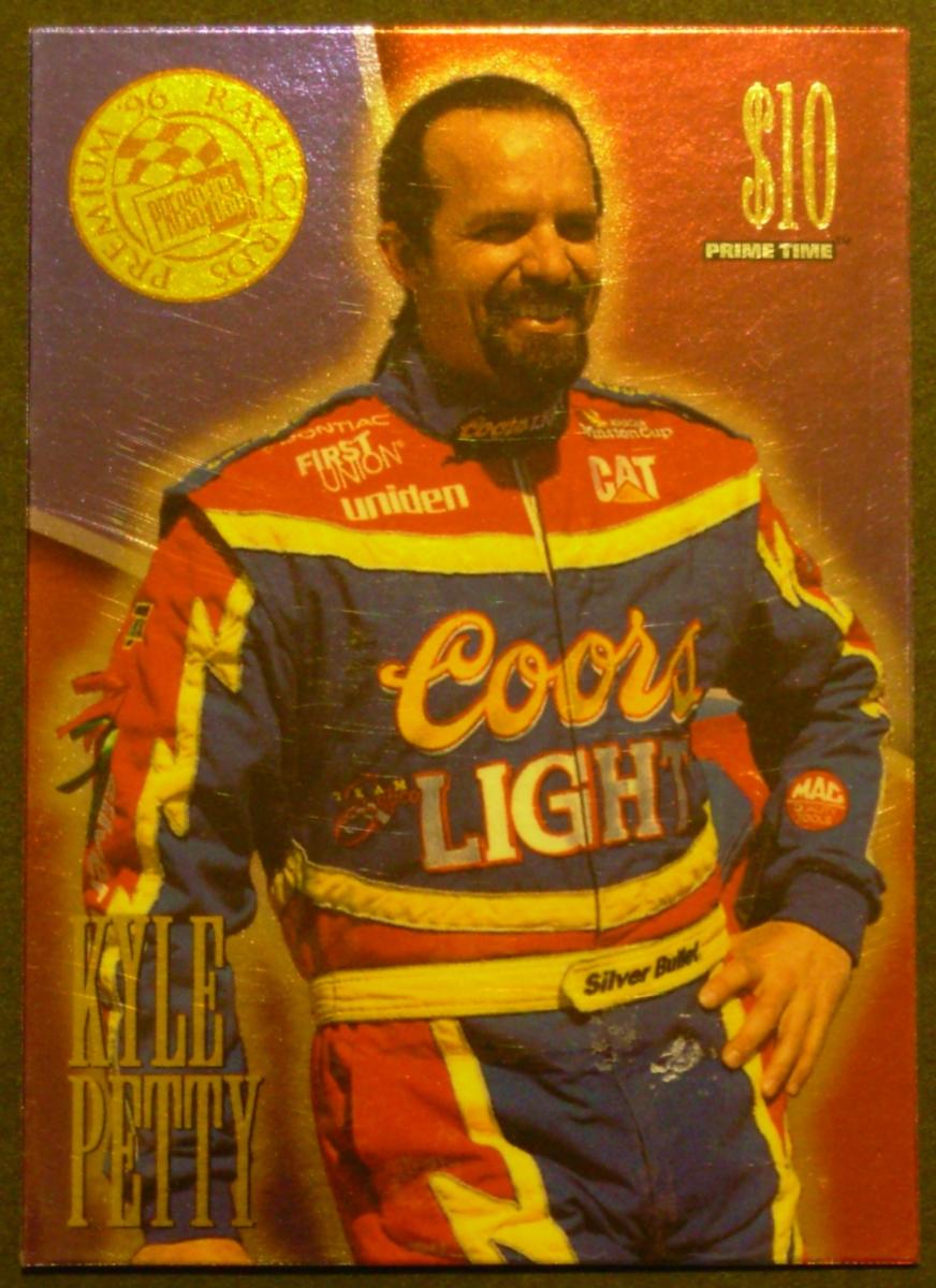 This card is a premium collectible related to the 1996 NASCAR season, emphasizing Kyle Petty’s status as a driver sponsored by Coors Light and other major companies. It is one of nine cards in this specific subset, denoted as number 8 of 9, making it a specialized item for fans of auto racing and sports collectibles.
