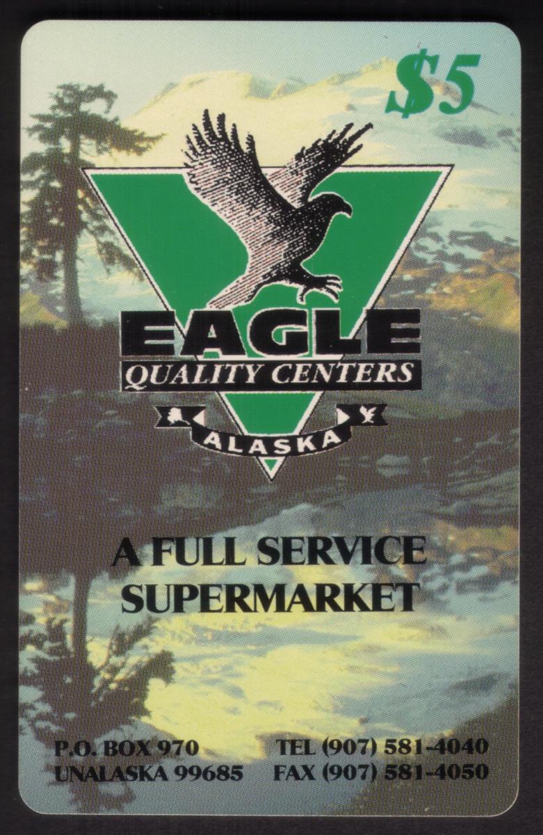 The collectible phone card features the logo of Eagle Quality Centers, a supermarket chain in Alaska. The logo prominently displays a green inverted triangle with a black eagle soaring forward overlaying the triangle. Below the eagle, the text "EAGLE" is written in large black capital letters followed by "QUALITY CENTERS" in smaller white capital letters set against a black rectangular background. Beneath the triangle, a banner with the word “ALASKA” appears.