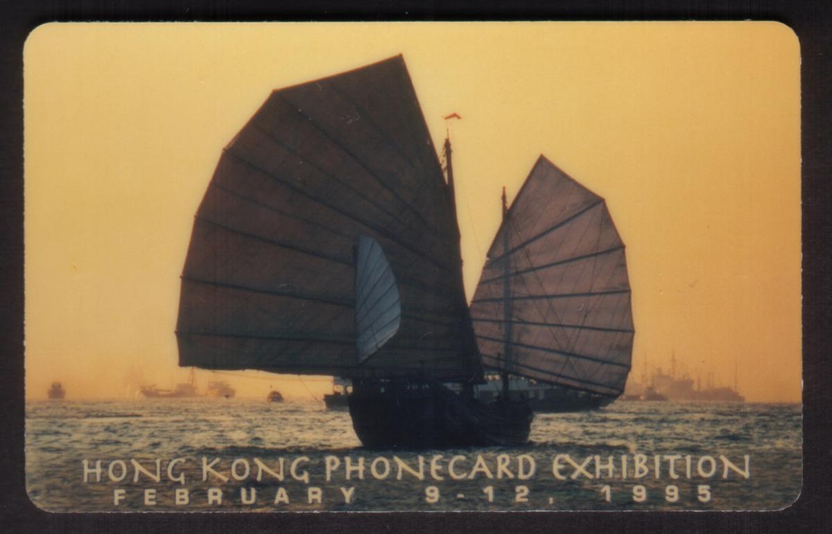At the bottom of the card, the text reads "HONG KONG PHONECARD EXHIBITION FEBRUARY 9-12, 1995," indicating the event and dates associated with this item. The card captures the maritime theme of sailing and boating, emphasizing travel and scenic sightseeing.
