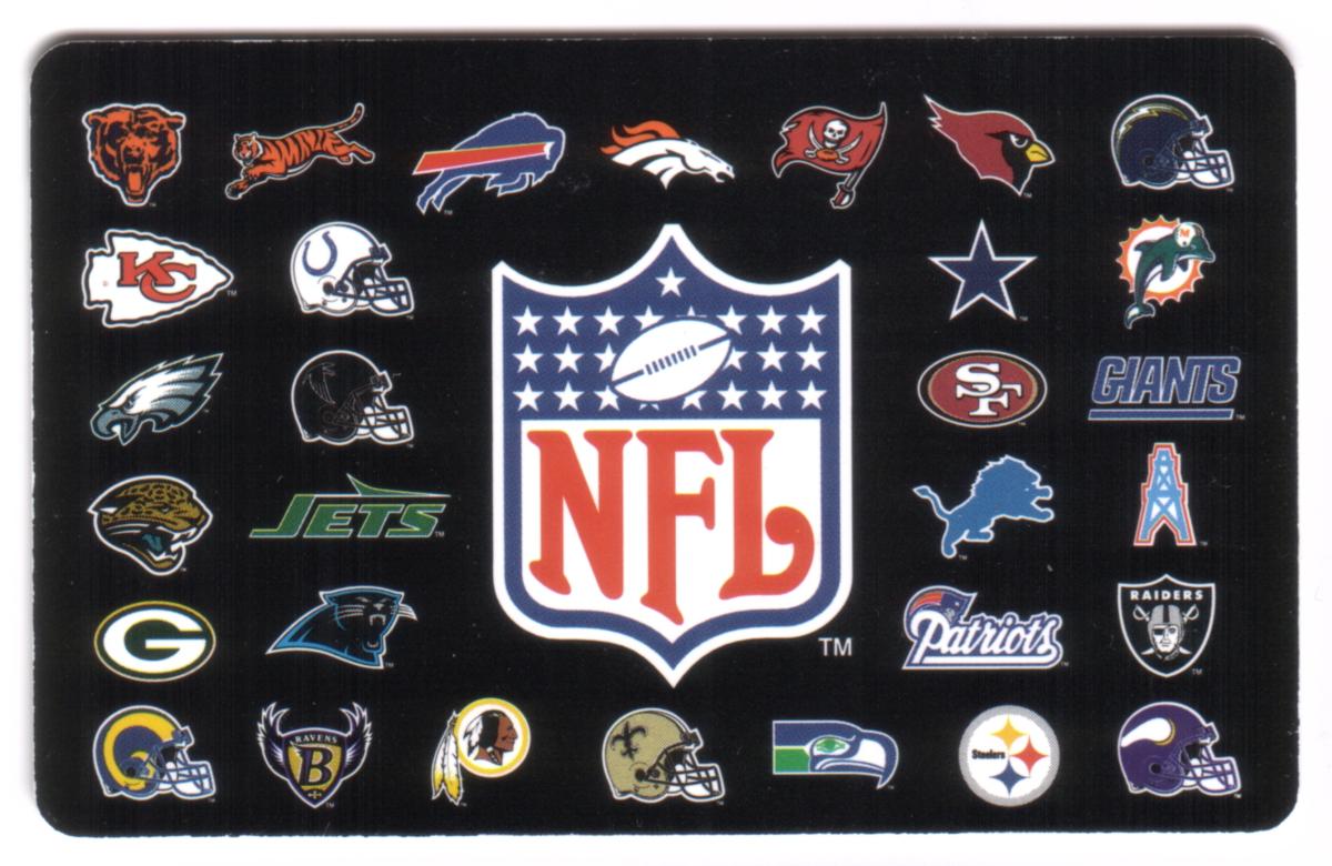 This is a collectible 1998 Sprint prepaid phone card featuring the official National Football League (NFL) shield logo centered on the card. Surrounding the NFL shield are the logos of 30 different NFL teams from both the American Football Conference (AFC) and National Football Conference (NFC). The team logos include iconic symbols such as the Chicago Bears, Denver Broncos, Tampa Bay Buccaneers, Kansas City Chiefs, Miami Dolphins, Dallas Cowboys, San Francisco 49ers, New York Giants, Philadelphia Eagles, Jacksonville Jaguars, Green Bay Packers, Carolina Panthers, New England Patriots, Oakland Raiders, Baltimore Ravens, Washington Redskins, New Orleans Saints, Seattle Seahawks, Pittsburgh Steelers, Minnesota Vikings, Buffalo Bills, Indianapolis Colts, Atlanta Falcons, and Detroit Lions, among others.