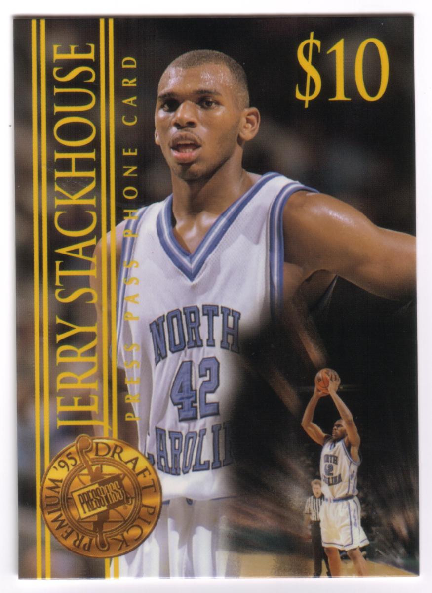 This collectible phone card features Jerry Stackhouse, a basketball player wearing a white North Carolina jersey with the number 42. The jersey reads "North Carolina" across the chest in blue letters outlined in white. The card is marked with a $10 value in the upper right corner.