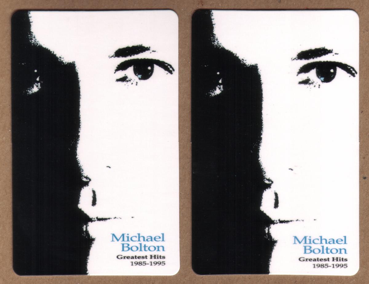 This set of two cards is collectible and promotional in nature, celebrating Michael Bolton’s career highlights during the designated period. The cards’ design is clean and monochromatic, with a strong focus on Michael Bolton’s facial features and the clear printed reference to his Greatest Hits album spanning 1985 to 1995.