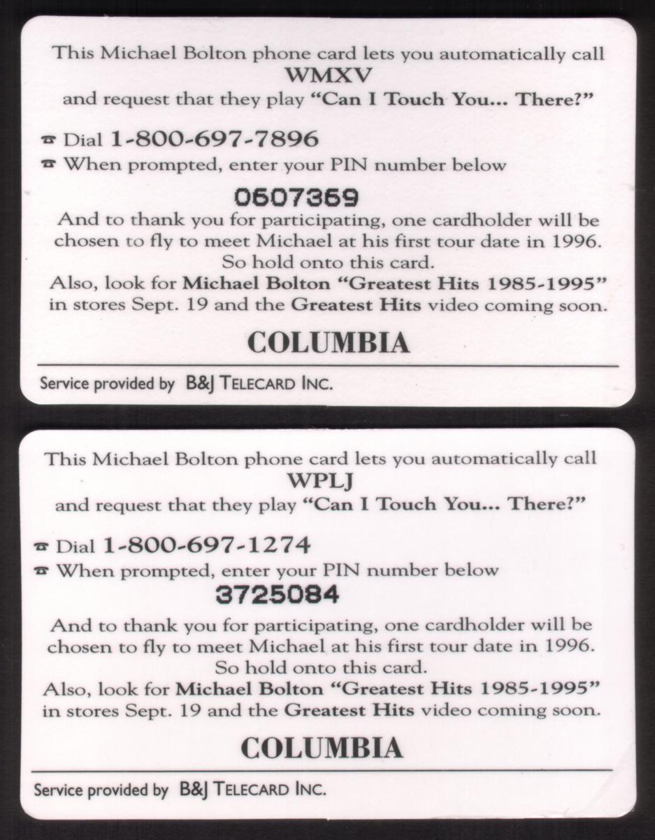These cards were created as a promotional interactive set by B&J Telecard, associated with 3M. The cards relate to the music industry, specifically highlighting Michael Bolton as a singer, songwriter, and musician. The imagery and text emphasize the artist’s identity and the era covered by the greatest hits compilation, spanning a decade from 1985 to 1995. The set links to radio promotions involving WMXV and WPLJ, Columbia Records, and WorldCom, reflecting promotional partnerships within the music and broadcasting industries.
