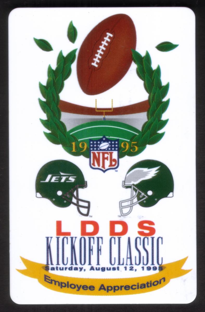 This card commemorates the 10u NFL 1995 Kickoff Classic game between the Jets and Eagles and is branded with LDDS and WorldCom, pointing to the companies involved in the employee appreciation promotion. The color scheme primarily features NFL team colors and official logos connected to this historic NFL season opener.