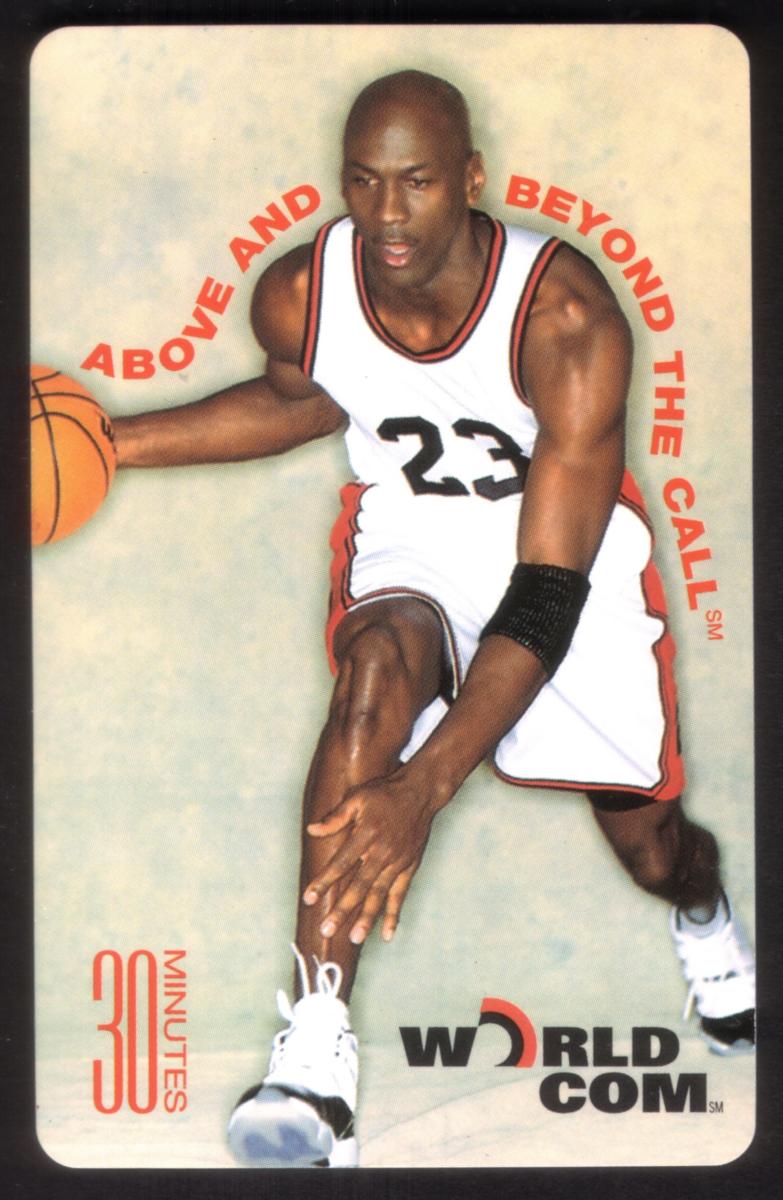 Curved text in red above Jordan reads "ABOVE AND BEYOND THE CALL," highlighting the card’s theme of excellence and dedication. The bottom left corner displays "30 MINUTES" in a vertical orientation, indicating the card’s usage value. The WorldCom logo is positioned along the bottom right, with the “D” stylized in red and black, identifying the telecommunications company that produced the card.