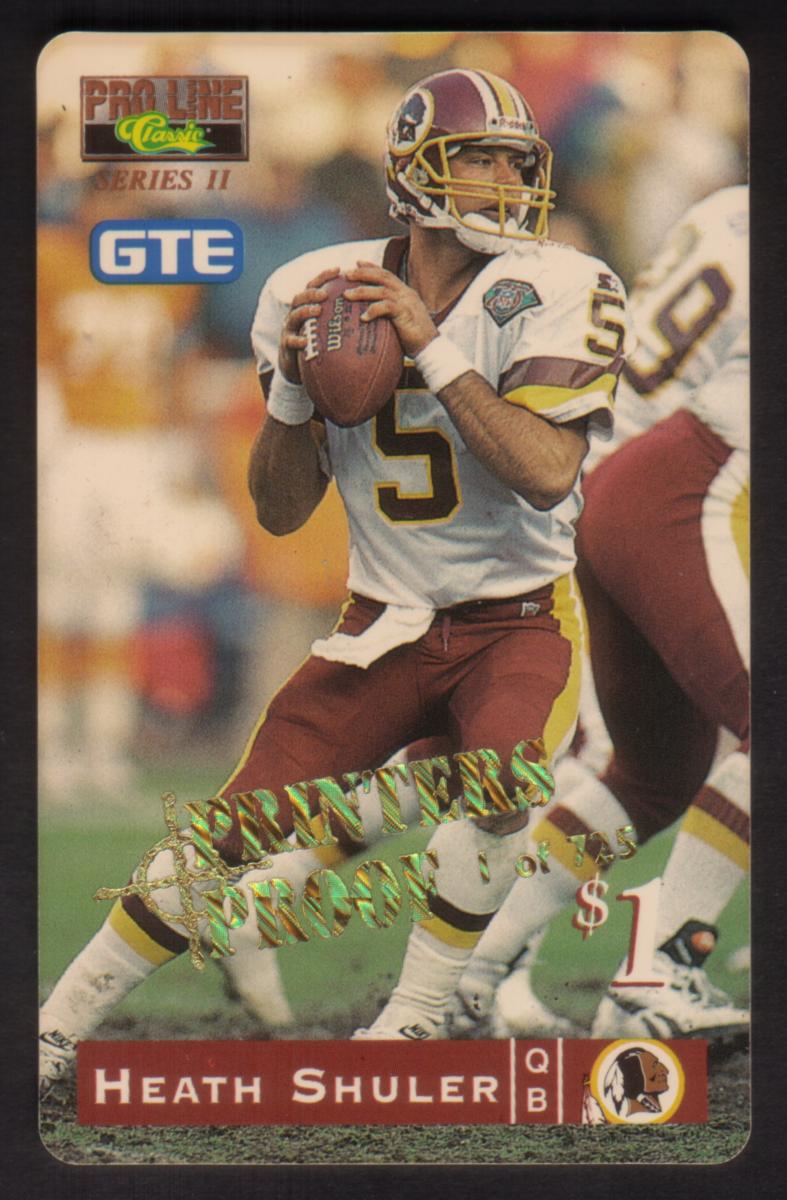 This collectible card features Heath Shuler, quarterback (QB) for the Washington Redskins, captured in an action pose holding a football, prepared to throw. The card is titled "Proline Classic Series II," and prominently includes the GTE logo in blue and white on the upper left side. The front displays a gold foil stamp reading "PRINTER'S PROOF" diagonally across the center. The card’s value is marked at $1 in red near the lower right area.