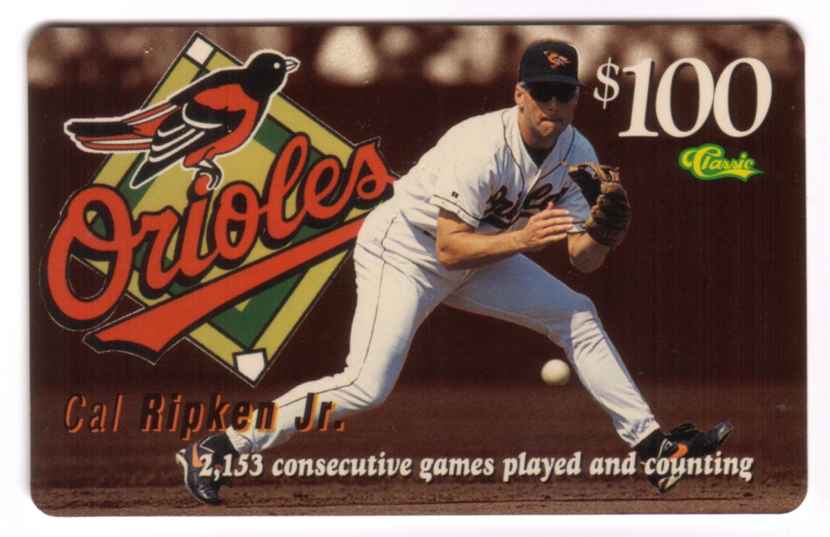 Text on the card highlights Cal Ripken Jr.'s remarkable achievement of "2,153 consecutive games played and counting," celebrating his endurance and dedication in MLB. The upper right corner displays the denomination "$100," accompanied by the "Classic" logo in green and yellow script. This card commemorates Ripken Jr.'s consecutive games played streak and his connection to the Baltimore Orioles.
