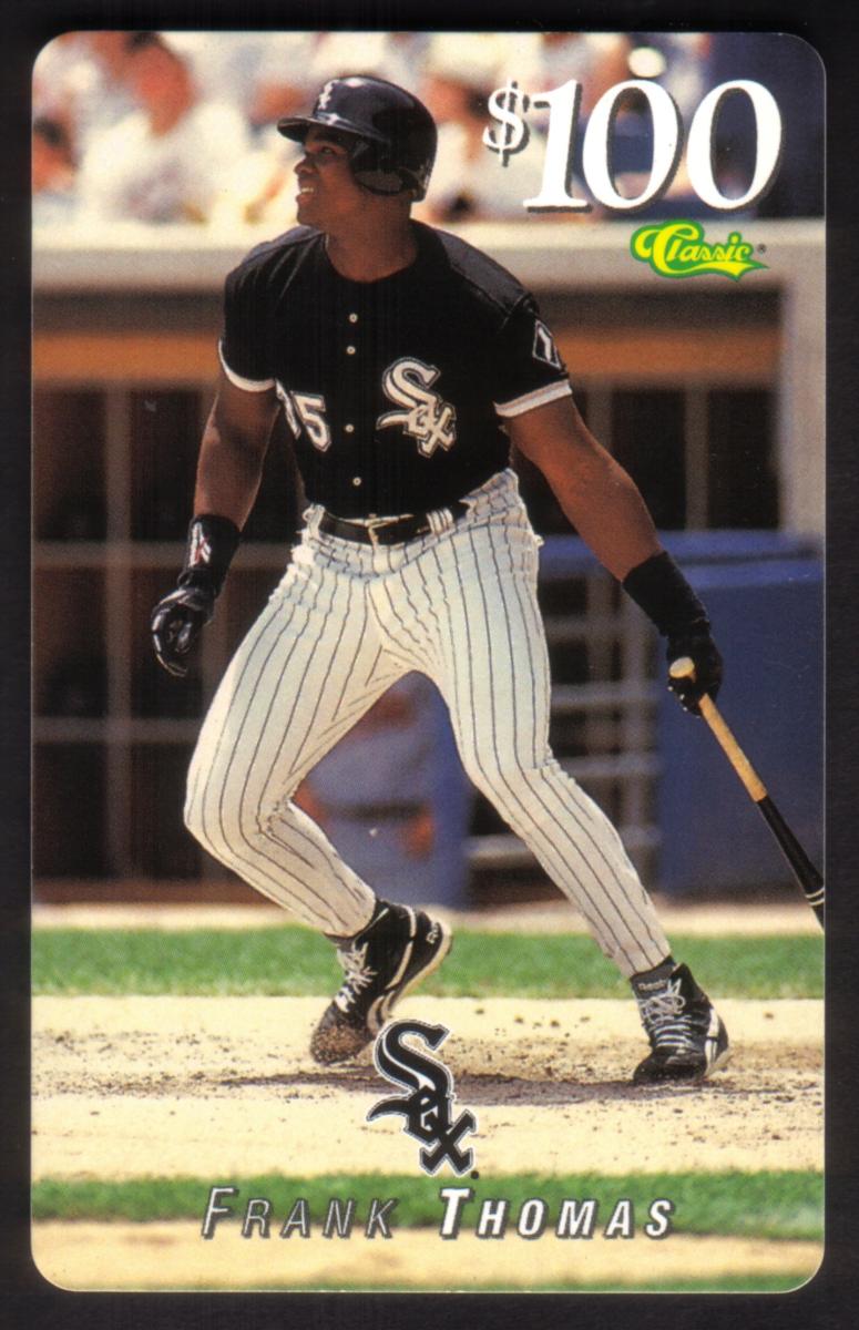 This card is associated with the MLB (Major League Baseball) and features one of the sport’s notable players, Frank Thomas, representing the White Sox uniform and style. It is a collectible item tied to baseball and MLB memorabilia.