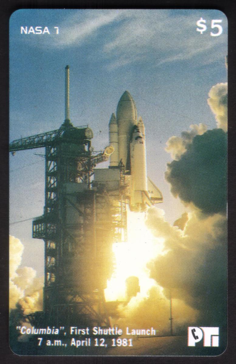The card displays the text "Columbia," First Shuttle Launch 7 a.m., April 12, 1981, referencing the historic initial mission of the Columbia shuttle. At the top left corner, it states "NASA 7," and the card value is indicated as $5 in the top right corner. The AT&T Teleticket logo is present at the bottom right, linking the card to international prepaid telecommunications services.