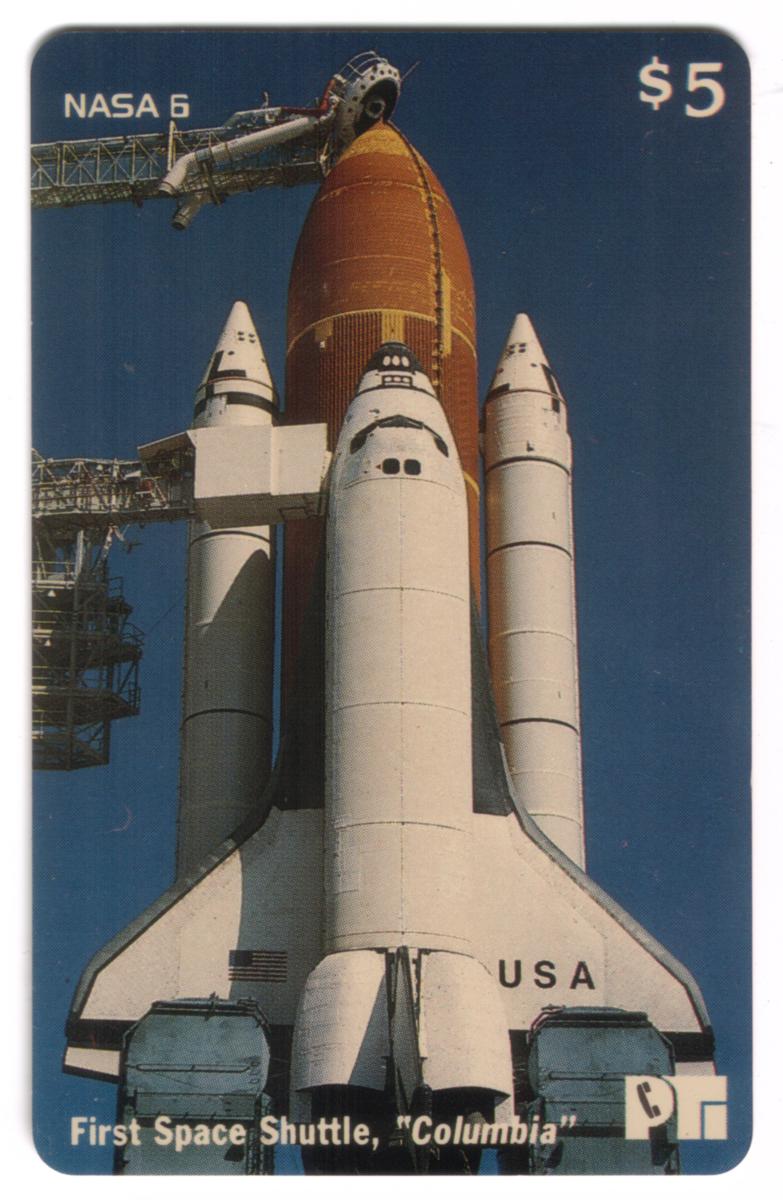Text on the card includes "NASA 6" in the upper left corner and the denomination "$5" in the upper right corner. At the bottom, the text reads "First Space Shuttle, 'Columbia'." The card design strongly ties to themes of space exploration, aeronautics, and NASA's history, specifically referencing the first space shuttle launch. The card is part of a series featuring space crafts and space shuttle imagery from the Kennedy Space Center.