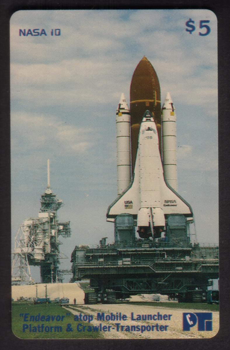 This collectible phone card features a detailed color photograph of the Space Shuttle Endeavor secured on its Mobile Launcher Platform and positioned atop a Crawler-Transporter. The shuttle is shown in vertical launch configuration with its external orange fuel tank and two solid rocket boosters prominently displayed. The image captures the equipment at Kennedy Space Center (KSC), with the launch tower visible to the left under a partly cloudy sky.