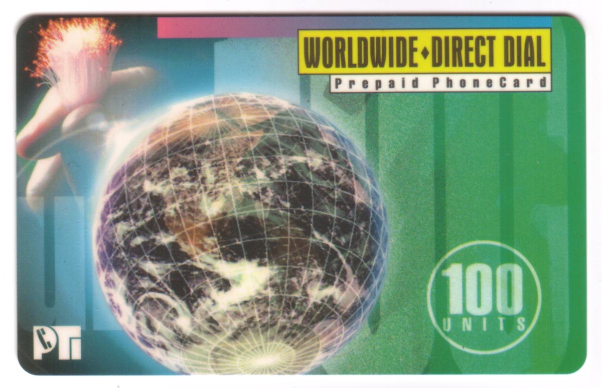 A white logo with the letters "PTI" is located in the bottom left corner of the card. The elements of the design emphasize global communication, technology, telecommunications, and information technology, consistent with the use of fiber optics and worldwide direct dialing.