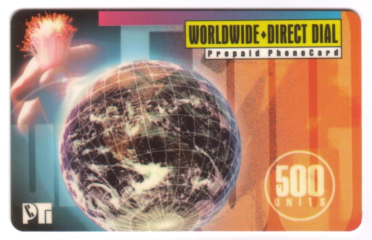 This card is identified by the keywords related to global communications, including globes, world maps, earth, technology, telecommunications, Information Technology (IT), Fiber Optics, and “Worldwide Direct Dial.” These elements emphasize the card’s function as an international prepaid telecom phone card designed for global calls using fiber optic technology.