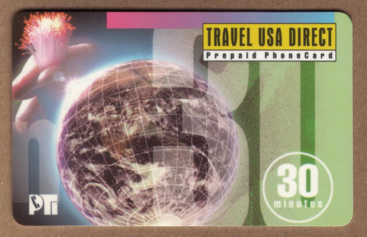 This collectible prepaid phone card is titled "Travel USA Direct" and offers 30 minutes of talk time. The card features a prominent Earth globe image in the center with a digital grid overlay representing world maps and global technology. Behind the globe and occupying the left side of the card is a partially visible hand holding fiber optic light strands, symbolizing telecommunications and information technology.