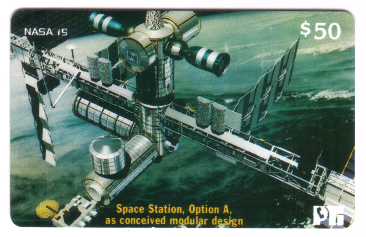 The upper left corner displays the text "NASA 15," while the upper right corner shows the denomination "$50." At the bottom center of the card, the caption reads, "Space Station, Option A, as conceived modular design," highlighting the subject and concept of the space station artwork. The card includes a small logo with the letters "PD" near the lower right corner.