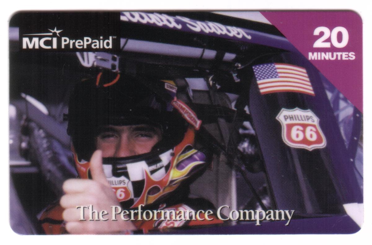 This collectible phone card features a close-up image of NASCAR driver Elliott Sadler seated inside a race car. Sadler is wearing a colorful racing helmet adorned with multiple Phillips 66 logos, one prominently displayed on the chin area. He is giving a thumbs-up gesture toward the camera. The car window displays an American flag decal next to a Phillips 66 logo. The phone card is issued by MCI PrePaid and offers 20 minutes of usage time. Across the lower center of the card are the words "The Performance Company" in white text. The card background includes part of the vehicle roof and window frame in dark colors.