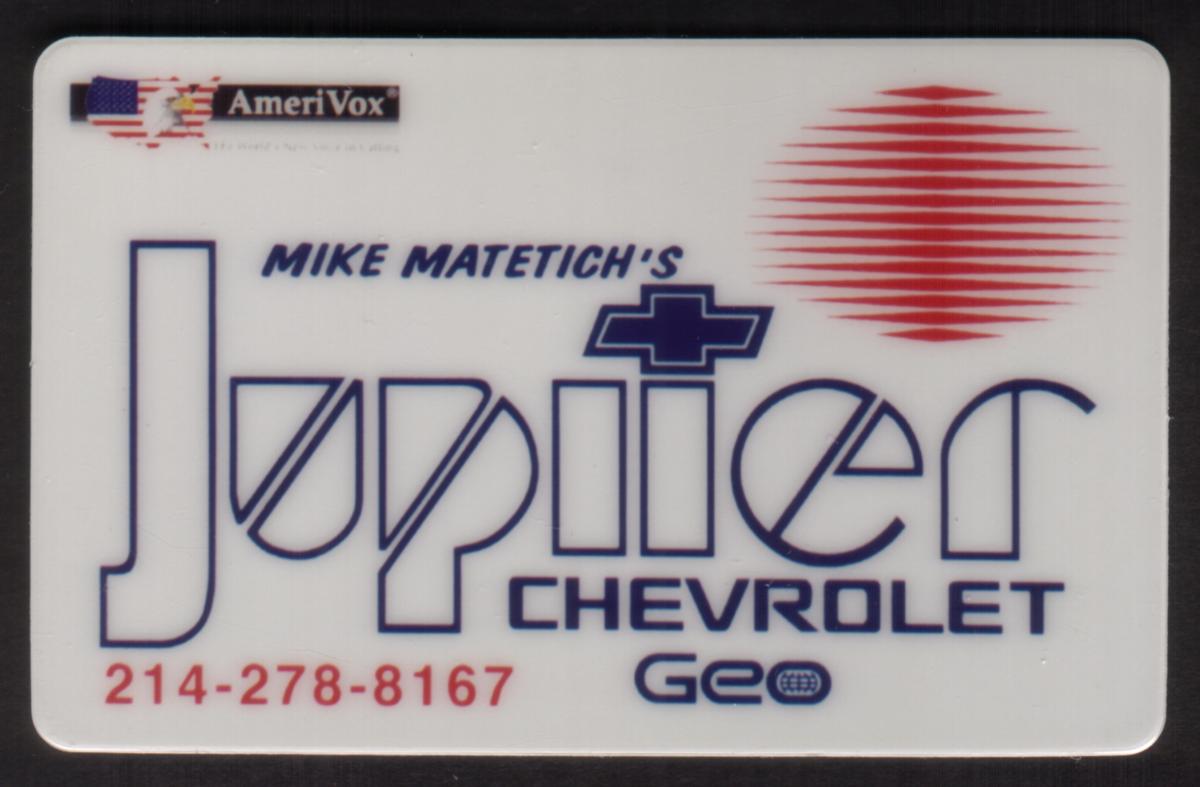 This collectible chip card features the corporate trademarks and logos of Jupiter Chevrolet Geo Car Dealership, located in Garland, Texas. The card prominently displays the Chevrolet and Geo brand names, which are associated with the automotive industry. The background image includes a classic red Chevrolet automobile, positioned in a way that highlights the vehicle’s design, emblem, and front grille. The Chevrolet bowtie logo is clearly visible, emphasizing the brand’s identity.