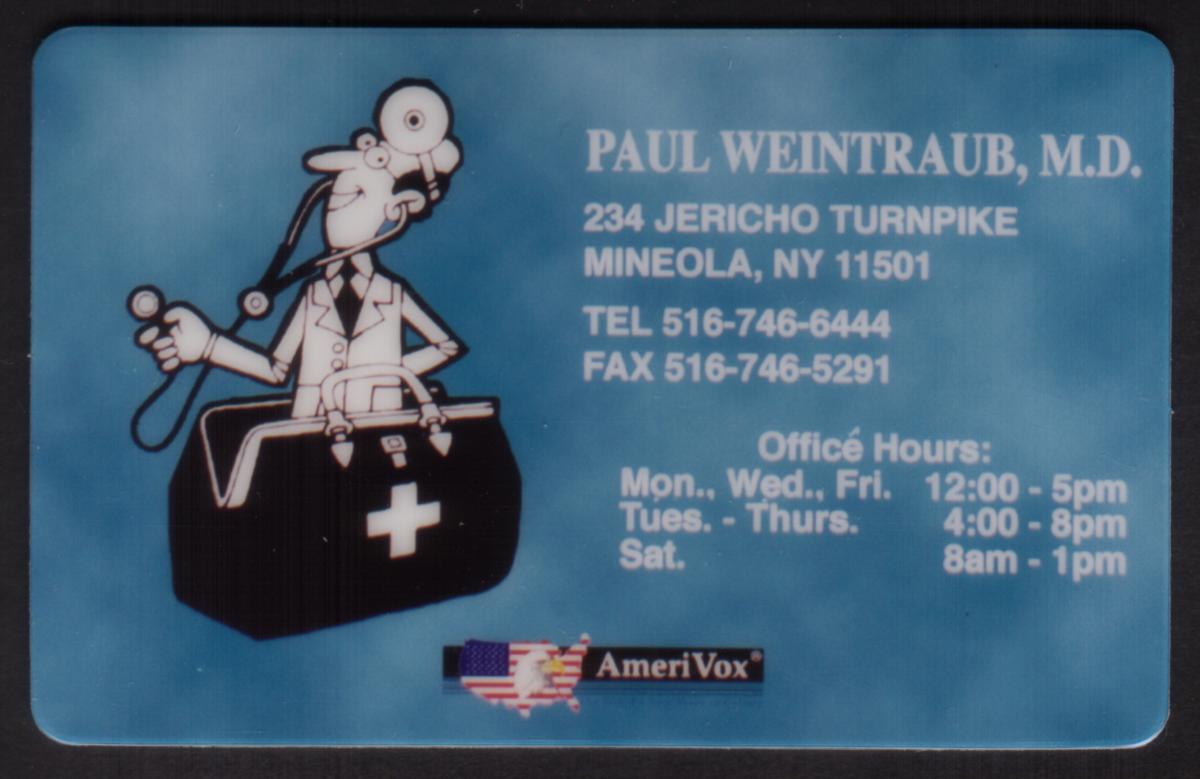 This collectible card features the name and professional details of Paul Weintraub, M.D., an Internal Medicine physician located at 234 Jericho Turnpike, Mineola, New York, 11501. The card prominently displays office contact information, including a telephone number (516-746-6444) and a fax number (516-746-5291). The doctor’s office hours are clearly listed as Monday, Wednesday, and Friday from 12:00 PM to 5:00 PM, Tuesday and Thursday from 4:00 PM to 8:00 PM, and Saturday from 8:00 AM to 1:00 PM.