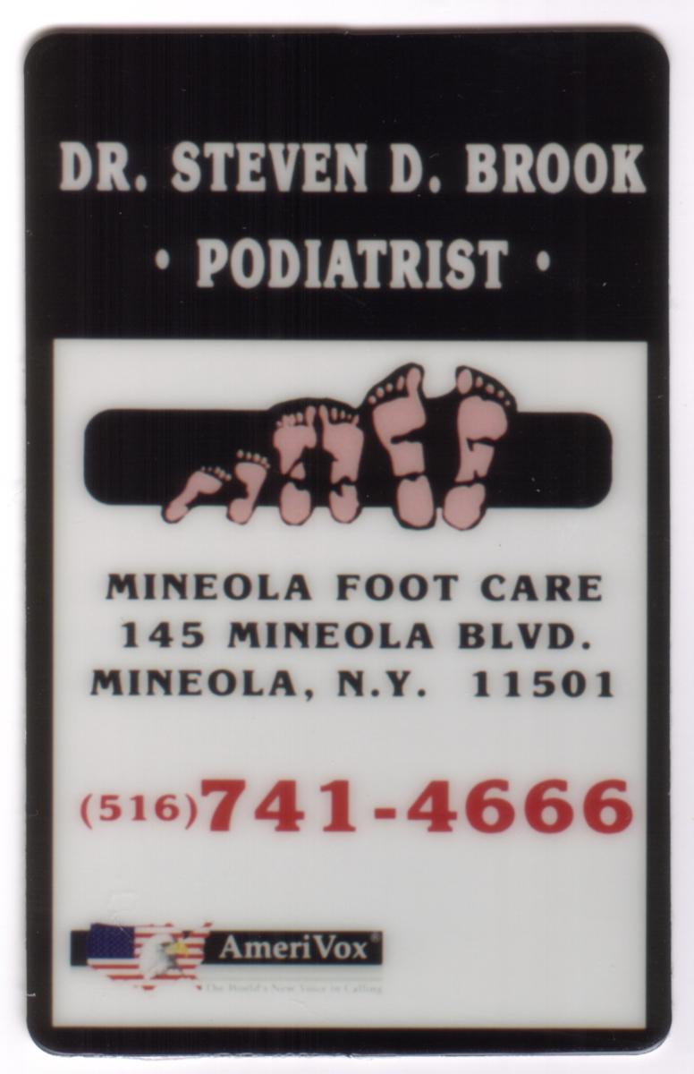 This collectible promotional card features Dr. Steven D. Brook, a podiatrist. The card prominently displays his professional title and specialty at the top in bold white letters against a black background: "DR. STEVEN D. BROOK • PODIATRIST •." Below this, there is an image showing a series of five footprints arranged from smallest to largest, symbolizing foot care across different ages or sizes.