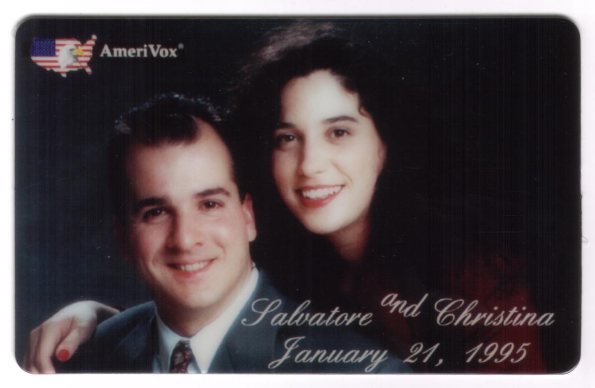 This collectible promotional phone card commemorates the marriage of Salvatore Lo Cascio Jr. and Christina on January 21, 1995. The card features their names prominently along with the date of the wedding, serving as a personal memento of the event. The word "AmeriVox" is displayed on the card, identifying the service or company associated with the card.