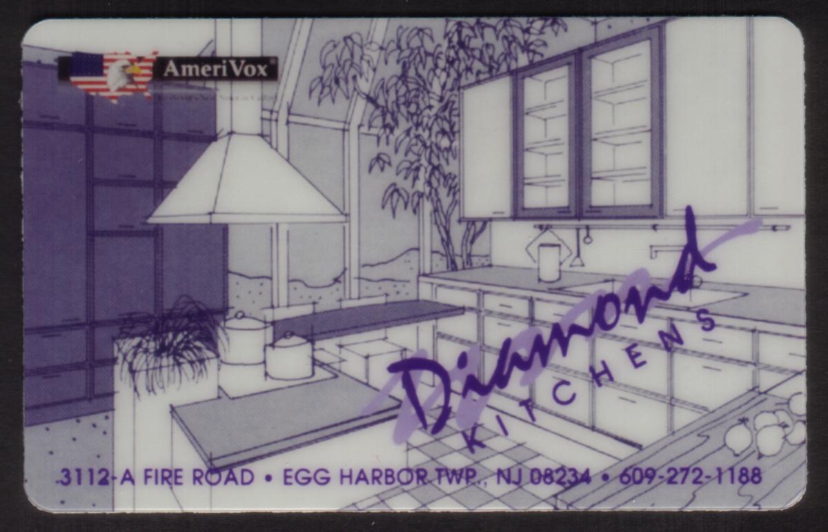 The card includes several logos and trademarks relevant to the home improvement industry. Notably, the AmeriVox logo appears prominently, indicating a connection with the AmeriVox brand as part of this promotional item. The artwork also contains text referencing Egg Harbor Turnpike, New Jersey, anchoring its geographical relevance to that area, specifically linked to Diamond Kitchens’ promotional efforts.