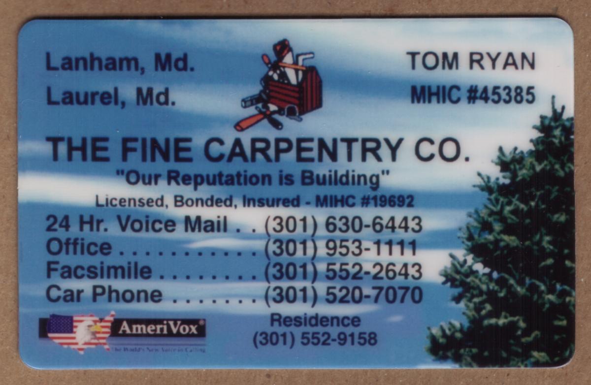 This collectible phone card features a detailed design highlighting The Fine Carpentry Company, with a prominent facsimile of the company’s name displayed near the bottom. The card emphasizes the theme of homebuilders and carpenters, specifically referencing Lanham, Maryland and Laurel, Maryland, locations highlighted on the card itself. The phrase "Our reputation is building" is clearly printed, underscoring the company’s identity and values.