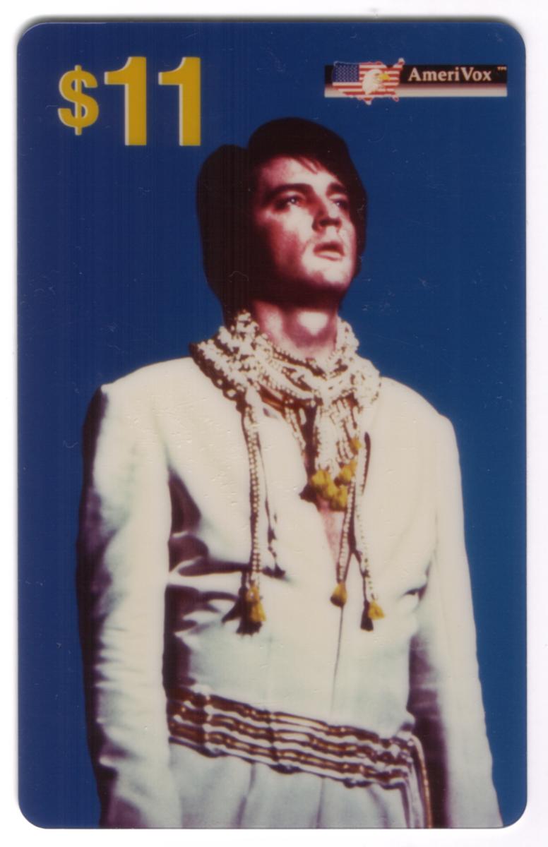 The card has a deep blue background with a large yellow "$11" denomination displayed in the upper left corner. In the top right corner, the AmeriVox logo is visible alongside a small American flag. The design emphasizes Elvis Presley as the King of Rock and Roll, highlighting his association with American entertainment culture including singing, acting, and celebrity status. This card commemorates Elvis’s legendary performances and persona during his time in Las Vegas.