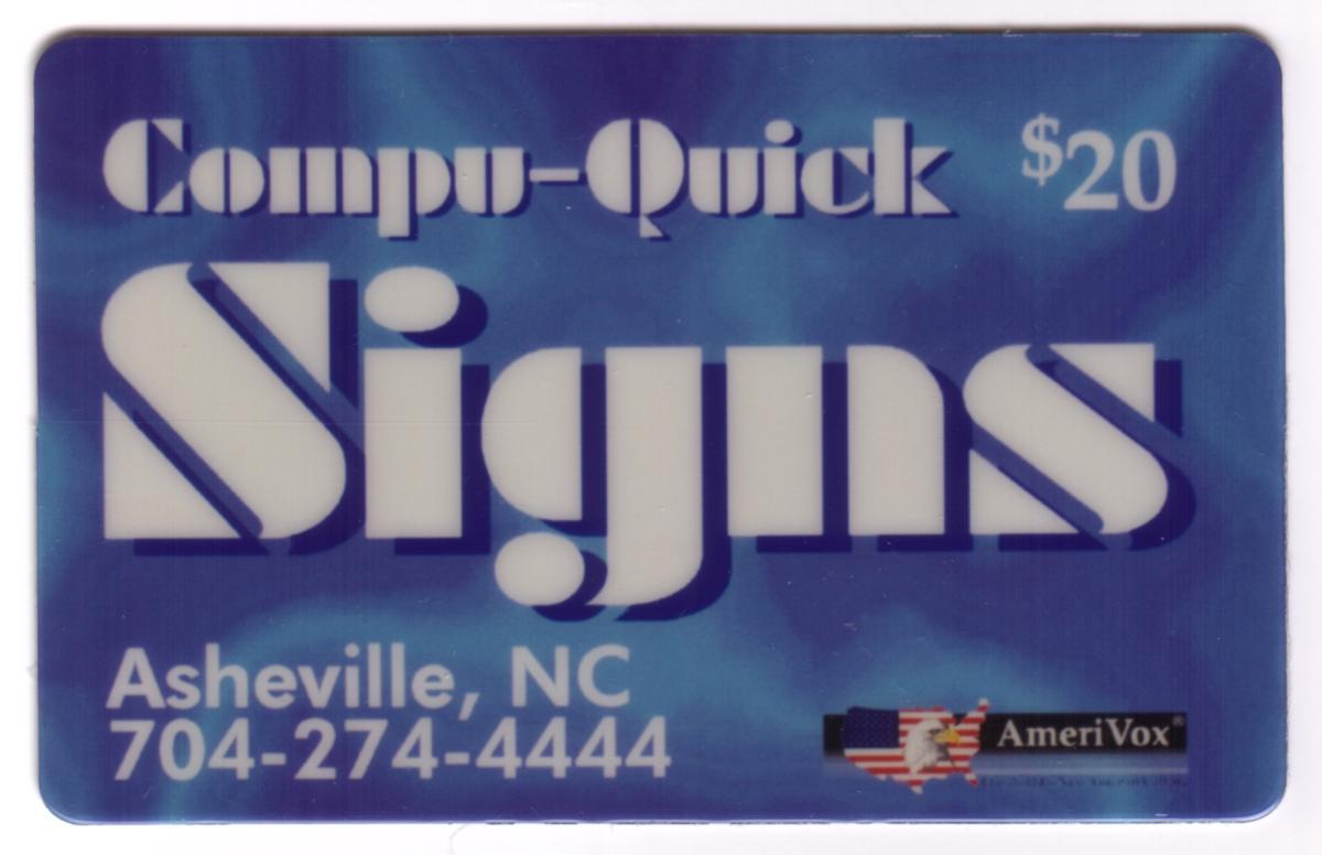 No additional imagery, characters, or logos aside from these words are present on the front of the card. The card serves as a telephone card with a prepaid value, emphasizing connection to Compu-Quick Signs and AmeriVox services and branding in Asheville.