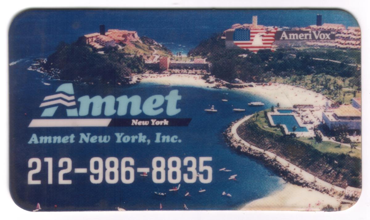 This 1992-era business card-sized collectible phone card was issued under Amnet Tourist Promotions in New York. The overall design, including the image and contact details, reflects its use for tourist marketing and telecommunications services linked to the Amnet network.