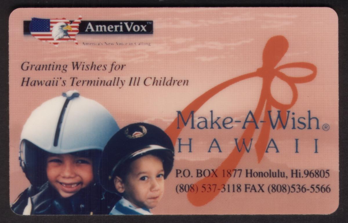 This card is marked as used and in Fine/Very Fine condition, issued in November 1993, and is linked to AmeriVox. It serves as a charitable fundraising collectible tied to the Make-A-Wish Foundation’s mission in Hawaii. The Make-A-Wish Foundation’s Children Wishbone Logo is a key design element, reinforcing the theme of hope and wishes for children in need.