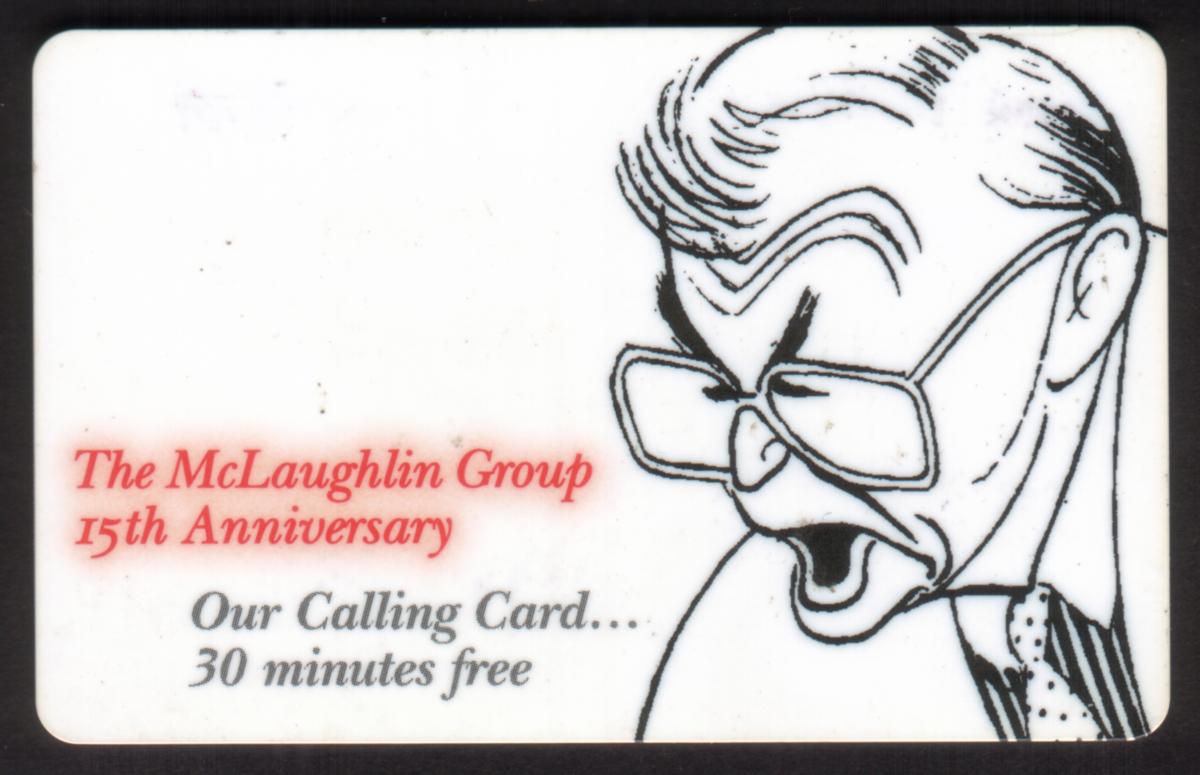 This phone card serves both as a functional calling card and a commemorative item celebrating the longevity and influence of The McLaughlin Group in American political discourse. It is a valuable collectible for enthusiasts interested in political media memorabilia and vintage telecommunications cards.