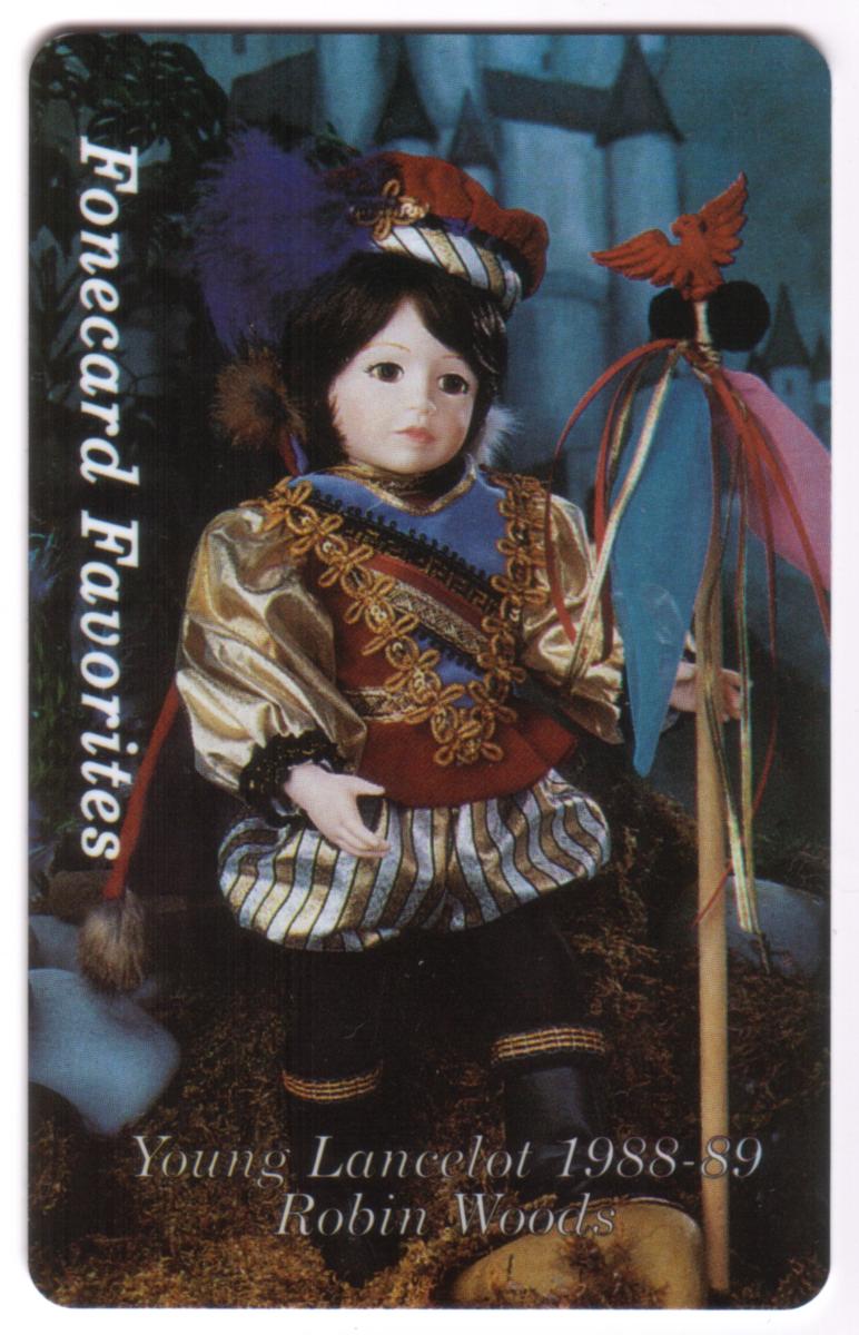 This collectible card features artwork by artist Robin Woods, showcasing a vinyl doll from the Camelot Collection titled "Young Lancelot." The card is part of the Fonecard Favorites series and prominently displays the doll representing Lancelot, a well-known figure from Arthurian legend. The design presents a detailed depiction of the doll in a medieval-style outfit, emphasizing the character’s youthful appearance with a helmet, tunic, and cape consistent with the Camelot theme.