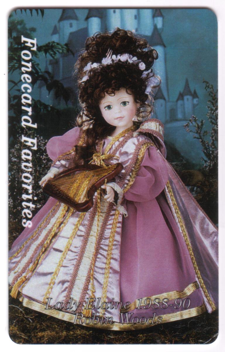 This collectible Fonecard Favorites features a detailed image of the Lady Elaine Doll from the Camelot Collection, created by artist Robin Woods. Lady Elaine is depicted with bright red hair and is dressed in a colorful outfit, consistent with the artist’s style. The card includes the words "Robin Woods Promo" and "Camelot Collection" printed clearly, highlighting the promotion and series to which the doll belongs.
