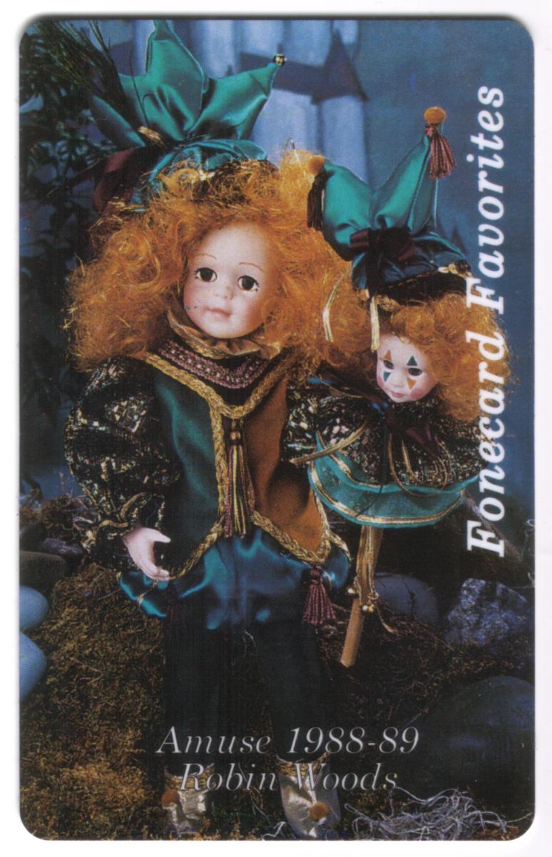 The card includes printed text that identifies the artist, Robin Woods, and specifies the collection name as Camelot Collection: Amuse Doll - Fonecard Favorites. The layout also contains the logo of Amuse Doll and the phrase "Fonecard Favorites," emphasizing its theme related to collectible phone cards featuring iconic doll characters. The overall presentation blends the doll’s visual appearance with branding elements that mark its origin and collectible category.