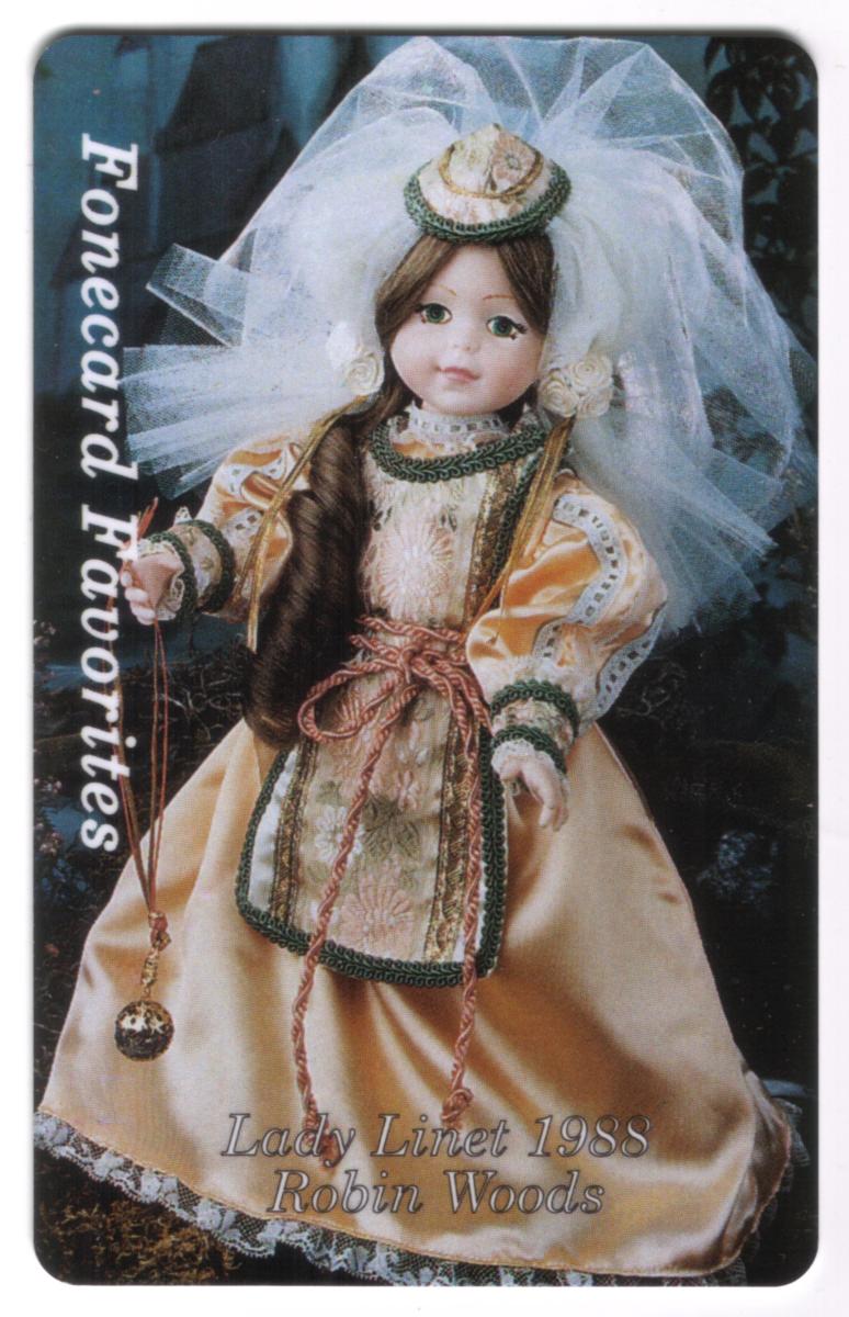 This complete set of seven collectible phone cards features vinyl dolls created by artist Robin Woods from the Camelot Collection, dated 1988-90. Each card displays a finely crafted doll dressed in detailed period costumes evocative of medieval and Renaissance themes. The cards are branded with "Fonecard Favorites" in white text along the left edge.
